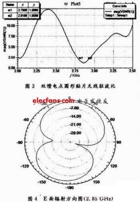 双馈电点圆形贴片天线仿真结果如图3,图4所示。图3给出了其驻波比,图4是其E面辐射方向图,可以看出在2.8~2.92 GHz范围内驻波比小于2。从图3,图4中可以看出达到了最初的设计目的。