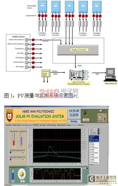 整套设备的核心是NI PXI-8184实时控制器,它提供了数据存储功能、有着极高的系统可靠性、紧凑性、坚固性和方便的可配置性。软件的开发是基于LabVIEW和LabVIEW实时模块进行的。PV测量与监测系统如图1所示。