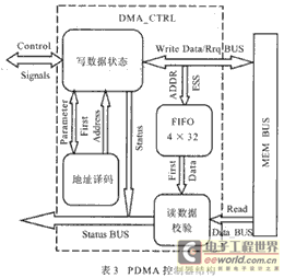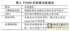 PDMA的控制器主要由:产生写数据的状态机、地址译码模块、FIFO以及读数据校验模块四部分构成。各模块的功能由表2描述。