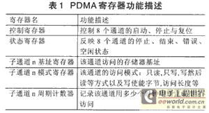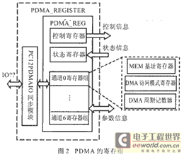 PDMA是可编程直接存储器存取的简称。图1 虚中框内是PDMA的内部模块结构,它主要由寄存器组和控制器两大部分构成,寄存器组用于保存配置参数和PDMA对SDRMA控制器访问后的状态信息及接收、启动、停止等控制信息。图2是 PDMA寄存器组的内部结构。