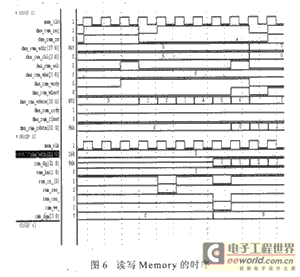 相对而言,我们更关注PDMA是如何访问Memory的。图6是由一个PDMA发起的写读模式下的访问时序。GROUP1的信号是由PDMA发起的内部Memory总线信号组,而GROUP2的信号是 Memory控制器和内存芯片间的符合jedec标准的总线协议。从图中我们可以清楚地看到总线协议的转换过程,及时发现是否有违反协议的情况发生。
