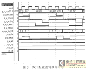 图5是由PCI发起的一次写IO寄存器访问的仿真波形,PDMA的配置数据就是通过若干这样的操作完成的。