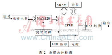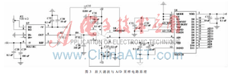 A/D采样电路是将输入的模拟信号转变为数字量,以便后续模块进行数字化处理。系统采用MAXIM公司的MAX120作为A/D采样器件,其转换时间是1.6 μs,采样率是500 kS/s。采样的数据依次循环存储在存储器中,由CPLD根据设定的延时时间从相应的存储单元调用数据交给DA转换。图3为放大滤波与A/D采样电路原理图。