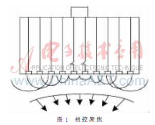 本系统以CPLD为控制核心,通过控制输入扬声器阵列的信号相位(延时),实现扬声器各阵元发射的声波束在空间叠加合成,从而形成声束聚焦的效果[3]。如图1所示,如果各阵元的激励时序是两端阵元先激励,逐渐向中间阵元加大延迟,使得合成的波阵面指向一个曲率中心,形成波束能够在空间聚焦,以达到增强声源指向性的目的。