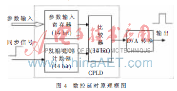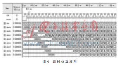 相控发射时CPLD的内部为每个超声通道提供了一个14 bit的延时计数器、一个14 bit比较器、一个14 bit的参数寄存器,用于暂存外部对CPLD写入的参数。一次相控发射开始之前,外部单片机控制端先后给CPLD内的参数输入寄存器设置各通道发射延时值。然后CPLD发出一个同步信号,启动CPLD内各通道延时计数器开始计数。当各通道预定延时值计满后,分别从参数输入寄存器调出数据送给DA转换,完成整个相控发射延时过程。相控发射延时的仿真波形如图5所示。其部分代码如下: