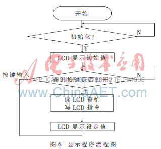 系统一上电即初始化,LCD默认显示第一路信号设定的初始值。当有按键输入改变各路信号的延时值,显示程序通过控制LCD的读/写选择端和数据/命令选择端来显示当前设定值。图6为显示程序流程图。