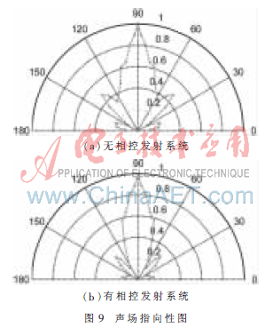 声发射阵列辐射声波在空气传播中会产生一定的指向性。添加相控系统后(如图8所示),在同等条件下阵列主波束中心声波强度提高了1 dB,旁瓣的声波强度降低,波束角(-3 dB)由原来的8.1°减小为6.7°,表明声波能量更为集中,主波束变得更加尖锐,旁瓣变小,阵列指向性得到加强。如图9所示,将实验结果测得各点的声压值进行归一化处理,更直观地反映出相控后声场指向性增强的变化。