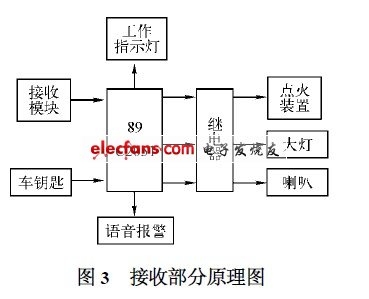 接收部分安装于汽车上,主要是对收到的信号码进行判断,做出相应操作。收到错误码,返回继续检测;收到超标码,报警音提示,点火装置断开,汽车大灯亮,喇叭响;收到不超标码,发出可行驶提示音,点火装置打开。结构框图如图3所示,可分为如下几个模块: