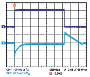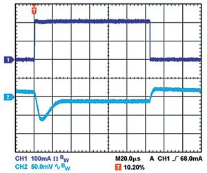 输出电容还会影响调节器对负载电流变化的响应。控制环路的大信号带宽有限,因此输出电容必须提供快速瞬变所需的大多数负载电流。当负载电流以500mA/μs的速率从1mA变为200mA时,1μF电容无法提供足够的电流,因而产生大约80mV的负载瞬态,如图1所示。当电容增加到10μF时,负载瞬态会降至约70mV,如图2所示。当输出电容再次增加并达到20μF时,调节器控制环路可进行跟踪,主动降低负载瞬态,如图3所示。这些示例都采用线性调节器ADP151,其输入和输出电压分别为5V和3.3V。