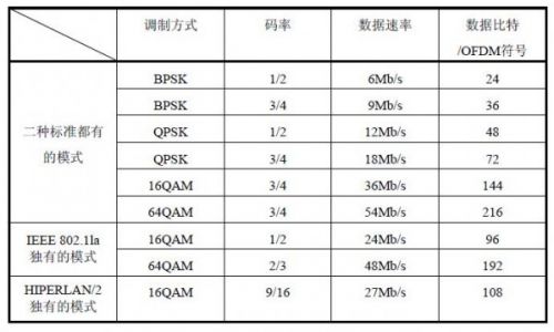 IEEE 802.11a是OFDM应用于WLAN的标准。IEEE 802.11a工作在5GHz频段。利用OFDM作为物理层技术。可提供6Mb/s到54Mb/s的数据速率。为了恢复处于不同衰落环境的子载波上的信号。它在不同的子载波上采用不同码率的编码方式。主要有1/2、2/3、3/4三种码率。其中1/2编码器采用约束长度为7的卷积编码,生成多项式为 (133,171),其他二种码率通过对1/2编码器进行凿孔获得。下表给出IEEE 802.11a支持的8种模式,为了对比,表中还给出了HIPERLAN/2支持的7种模式。
