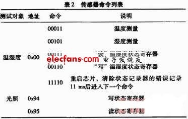 (2)地址与测试对象命令。该命令包含3个地址位和5个命令位,其后为应答ACK位,表示SHT11正确收到命令。传感器命令列表,如表2所示。