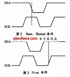 Start和Stop条件:主机通过发送Start条件启动通信,Start、Repeated Start条件如图2所示,Stop条件如图3所示。