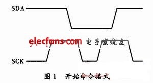 (1)传输开始。在SCK为高时使SDA由高电平变为低电平,并在下一个SCK为高时将SDA升高,如图1所示。