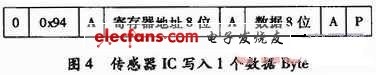 写数据格式:图4所示为向传感器IC写入1个字节数据时的正确帧格式。