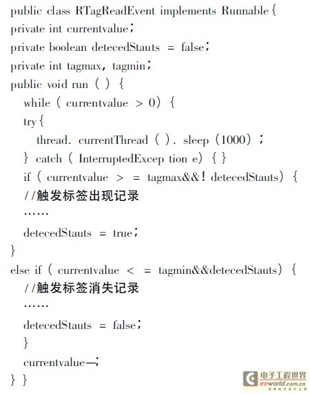 当过滤模块主程序检测到一个新标签时,便为其建立一个RTagReadEvent类的对象newReadTag,并对各个关键字段赋初值,同时启动该对象内部的计时器线程:newThread(newRead-Tag)。start()。该计时器线程的作用是每个报告周期对标签权值value进行检查并触发相应操作。每次检查后将标签权值currrentvalue减1,以实现当标签未被报告时其权值的逐步下降。当权值currentvalue减到0时,计时器线程停止,这时可以销毁该对象。