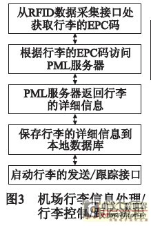 信息处理/行李控制/跟踪业务处理逻辑如图3所示。当行李通过行李入口时,由设置在行李入口的行李标签探测器读取行李的EPC码,然后通过数据采集接口交由行李信息处理模块,机场行李入口处可以安装多部行李标签条形码信息分拣机,一部分用于国内飞行,其他用于国际飞行。行李分拣机还为不可读标签提供了手动编码区。例如,上海浦东机场行李分拣机系统,无论是国际航班还是国内航班,抵达上海还是在上海中转,都能够轻松地进行行李分拣。系统也提供了早期行李分拣功能,将经过核对的行李通过旋转式传送带送达合适位置,从而能够在飞机起飞前就对其进行有序存储。