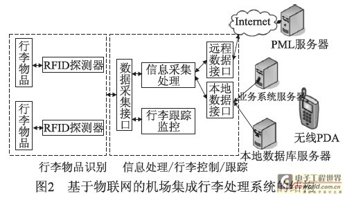 基于物联网的机场集成行李处理系统的结构如图2所示。它主要由行李物品识别、信息处理/行李控制/跟踪、PML服务器、本地数据库服务器、业务系统五大模块组成。