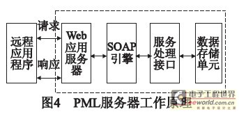 该服务器主要是由航空公司创建并维护的旅客信息服务器,它以标准的XML为基础,提供行李的详细信息,如行李类别和旅客ID、登机日期和登机地、有效日期、应运往何地等信息,并允许通过行李的EPC码对行李信息进行查询。PML服务架构在一个Web服务器之上,服务处理程序将数据存储单元中的行李数据转换成标准的XML格式,并通过SOAP引擎向客户端提供服务,PML服务器屏蔽了数据存储的异构性,以统一的格式向接口请求端提供信息服务。PML服务器的工作原理如图4所示。