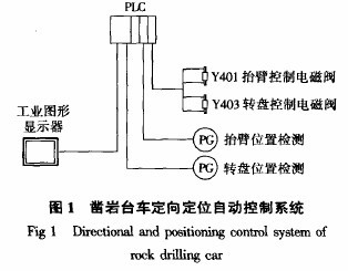 凿岩台车定向定位系统主要由旋转编码器、PLC和工业图形显示器构成(见图1)。抬臂位置和转盘位置由旋转编码器检测,旋转编码器的角度信号进入PLC后,由PLC进行处理和运算,并通过通信口将处理后的角度信号送到工业图形显示器上显示,与此同时,通过工业图形显示器接受操作工的定位角度输入指令,根据定位角度输入指令,由PLC自动控制凿岩台车相应的电磁阀,操作凿岩臂运行到指定角度。