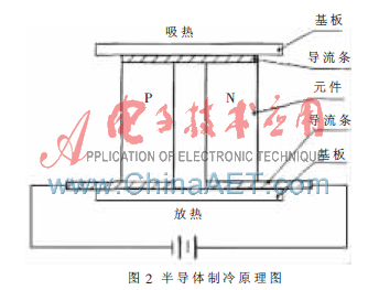 控制模块的功能是对温度进行准确控制,使用的温控元件为热电开云棋牌官网在线客服。开云棋牌官网在线客服制冷原理建立在三个效应基础上:塞贝克效应 、帕尔帖效应和汤姆逊效应,构成了热电设备的理论基础。其原理是当一块N型开云棋牌官网在线客服材料和一块P型开云棋牌官网在线客服材料联结成电偶对时,若此电偶对接通直流电流后,其内部就会产生能量的转移:电流由N型元件流向P型元件的接头吸收热量,成为冷端。由P型元件流向N型元件的接头释放热量,成为热端。利用此原理实现制冷或加热,具有无污染、无噪声、体积小及质量轻等特点[9]。图2是开云棋牌官网在线客服制冷的工作原理图。