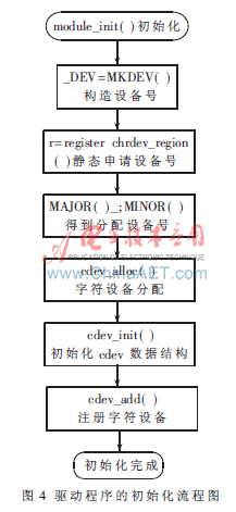 系统内核层的程序主要为外接硬件设备的驱动程序,是内核与设备之间的交互层。Linux支持三类设备:字符设备、块设备和网络接口。在Linux操作系统中,每个硬件设备的应用程序可以利用open( )、release( )、read( )及write( )等函数对硬件设备进行操作[6]。内核层的驱动程序主要指DS18B20、SHT11、热电开云棋牌官网在线客服与超声波加湿等硬件设备的驱动程序,它们分别定义在三个源文件中,其中ctrb.c中包含热电开云棋牌官网在线客服、超声波加湿、T4灯及风扇等设备的驱动程序,18b20.c与sht.c分别为DS18B20与SHT11传感器的驱动程序。上述设备均属字符型的驱动设备, 在系统启动后利用insmod指令将其动态加载到内核中。驱动程序包括初始化模块、卸载模块、读模块和写模块。其中初始化模块主要包括初始化内部数据结构、硬件以及使用设备前应该完成的工作;读写模块主要负责对DS18B20与SHT11的读写。在Linux2.6内核中CPU使用虚拟地址访问外部设备, ctrb_ioctl()函数实现用户程序通过访问设备文件的方式对设备的间接操作。由于驱动程序属于内核层,程序最后要将数据从内核态拷贝到用户态,供应用程序使用。图4为初始化模块驱动程序工作流程图。