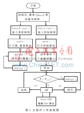 在工作算法中添加模糊PID自适应控制,使控制器能够在线自动调整比例系数Kp、积分系数Ki和微分系数Kd,以期获得最佳的温度控制。在PID控制器中,比例系数Kp值的选取决定于系统的响应速度,积分控制Ki用于消除系统的稳态误差,微分系数Kd在于改变系统的动态特性。调节初期选取较大的Kp值以提高响应速度,较小的Ki值以防止积分饱和,Kd=0以保证系统的稳定性;在调节中期,随着误差的减小Kp也逐渐变小,Ki值加大以尽量消除余差,Kd值取较小值以调节系统的动态特性;在调节过程后期,Kp值调到较小值以保证系统的平稳性,Ki值取适中以消除余差,Kd值取小值以控制过程的制动作用[5]。主程序的工作流程如图5所示。