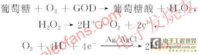 本仪器的检测原理是基于在电极表面固化上葡萄糖氧化酶(GOD),当血液滴入血糖测试电极后,发生了氧化还原反应,在反应过程中传输介质中的二价铁离子失去电子,发生了氧化反应,葡萄糖氧化酶氧化葡萄糖生成H2O2和葡萄糖酸,H2O2将二价铁离子氧化,氧化还原过程中发生了电子得失现象,在一定电压的作用下,形成了氧化电流。通过检测电流变化与葡萄糖浓度近似呈线性关系,从而达到检测血糖浓度的目的。具体的反应方程式如下: