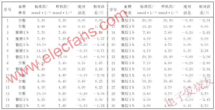按照1998年WTO 推荐的非胰岛素依赖型糖尿病(NIDDW)的诊断标准,血糖小于7mmol/L为非糖尿病人(空腹血糖3。5~ 7 mmol/L 为正常范围),7~11。1mmol/L为糖耐量低下,大于11。1mmol/L为糖尿病人。经过不同样本的测试,本仪器的测试范围可以达到2。2~27。8mmol/L,完全覆盖了人体血糖可能值的范围。