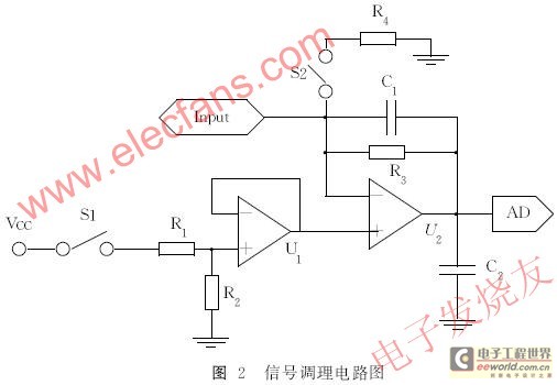 检测系统中信号调理电路如图2所示。仪器开机上电后,单片机控制多路开关S1闭合,前级运放输入为R1和R2分压值,设定为0.4V。根据跟随器和理想运放特性,此时后级输出不变也为0.4V,经过A/D 变换输入单片机,控制显示屏显示“请插入试纸”。当系统插入血糖试纸时,S2闭合,R4引入电路。后级运放构成同相放大器,调整R4使电路输出值为0.6V。经过A/D 变换输入单片机,并控制显示屏显示“请滴血”。滴血后产生的电流信号从“Input”输入,输出电压信号突变并变换后输入单片机,反应结束后根据电压变化计算出血糖值并显示。
