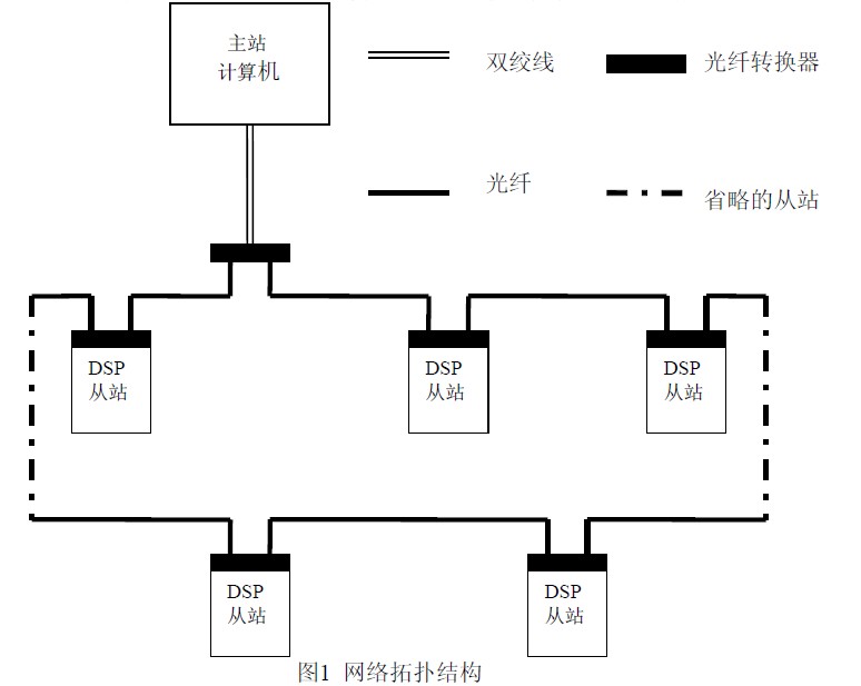 该光纤监控网络采用RS485总线的单主多从结构,主站用PC机,从站用DSP,采用多模光纤连接,组建成带双环自愈功能的光纤环网。带双环自愈功能光纤环网的优点是:当网络上某个节点的光纤转换器出现故障时,其它节点仍能正常通讯。光纤转换器采用武汉迈威公司生产的MWF5100P,它把RS232信号转换成统一的光信号传输。DSP采用TI公司的TMS320LF2407A。