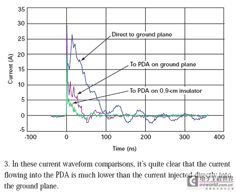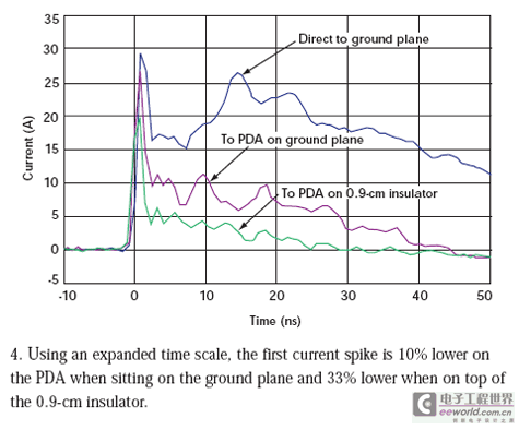 但是,我们见到的电流减小前后并不一致。当PDA直接放在接地板上时,初始电流尖峰降低了10%。当PDA放在0.9cm绝缘层上时,初始电流尖峰减低33%(图 4)。在20ns点,直接放在接地板上的PDA受到的冲击要小69%,而位于绝缘层上的PDA受到的冲击要小93%。电流减少是在冲击状态下给PDA充电的结果。在每次冲击测试过程结束后,我们必须将PDA接地使它回到未充电状态才能进行下次测量。