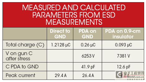 对充电到PDA的电流进行积分,可以得到从ESD qiang转移到PDA的电荷数量。从ESD qiang转移到PDA的电荷量可以用来计算ESD qiang的150pF电容上剩下的电压,然后再算出PDA上的电压。理解这个电压以及PDA上测到的电荷之后,就可以计算出PDA和接地板之间的电容(见表1)。