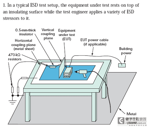 对于小型产品来说,工程师经常在专门的测试环境中执行系统级ESD测试(图1)。对IEC 61000-4-2测试而言,这些测试环境包括:地板上的金属接地板、木桌、放在桌子上的金属水平耦合板(到接地板有个0.95米长的连线,在水平耦合板之上的一个0.5mm绝缘层)。