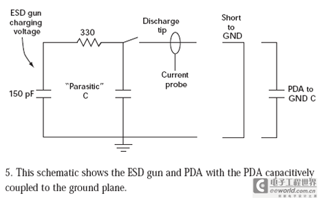 向PDA的放电通过一个并行平板电容表示,其中一个极板是PDA的一部分,另一个极板是接地板。在脉冲初期,PDA电容提供较低的阻抗,注入进PDA的电流近似于到地的放电电流。继续施加脉冲,电荷在PDA到接地板电容中累积,因此PDA上的电位上升,直到PDA和接地板之间的电位和150pF电容上的电压相等。这时,不再有电流流动,即使ESD qiang的电容还没有完全放电。