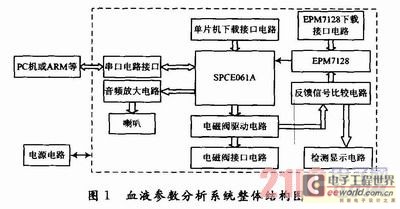 系统通过13路电磁阀和1路压力泵来控制整台仪器的流路。控制系统接到传来的指令时,打开相应的血液样本的通路,各种不同液路之间通过电磁阀进行隔离和导通。控制在凌阳SPCE061A单片机中实现,SPCE061A单片机的I/O口只有32位,系统的I/O口将不够用,故而使用EPM 7128作为逻辑控制单元。通过通用异步串口UART与SPCE061A进行通信,实现对每个回路的工作状态的检测结果的处理和报警。反馈比较芯片采用339,输出后传送到EPM7128处理,最后反馈到单片机。音频放大电路采用SPY0030集成芯片,能够取得很好的放大效果。