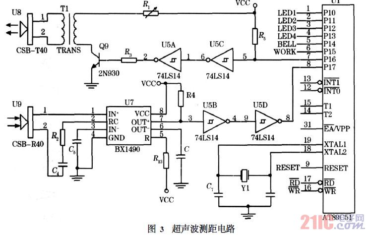 超声波测距电路主要包括两个部分:超声波发射电路和超声波接收电路,具体的电路设计如图3所示。图2中上半部分就是超声波发射电路,微处理器AT89C51通过编程在端口P16产生一个40kHz的超声波信号,经过两个74LS14非门将信号驱动整形,再由三极管Q9对其进行放大,最后经过变压器T1送到超声波传感器CSB-T40,这样就可以通过超声波传感器CSB-T40发出相应的超声波信号。而图3中的下半部分就是超声波接收电路,超声波信号通过障碍物发射到超声波传感器CSB-R40后,产生一定的电信号,电信号通过集成块BX1490放大后送到了2个74LS14非门电路整形,最后进入微处理器AT89C51的P17端口。这样就完成了1次超声波测距的扫描过程,它可以通过程序来控制计数器,将计数器的数据转换为相应的时间,再用时间乘以超声波的传播速度后除以2,既可以得到障碍物与超声波传感器之间的距离。