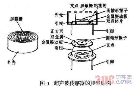 超声波传感器是利用超声波的特性而研制的传感器,超声波传感器的典型结构如图1所示。它是把成正方形的两个压电晶片(亦称双晶振子)按照相反的极性粘贴在一起,再引出两个电极。压电晶片上面有金属震动板和圆锥形振子。圆锥形振子具有很强的方向性,便于发送和接收超声波。超声波传感器采用金属或塑料外壳,其顶部有屏蔽栅。