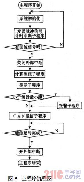 系统主程序主要包括系统的启动后对系统的初始化、超声波发射与接收、中断管理、计时程序、测距计算、结果显示、CAN通信、报警等其他子程序组成。根据以上超声波测距仪的工作原理描述,系统主程序的流程图设计如图5所示。在主程序初始化后就进入超声波信号发送程序,即利用程序产生超声波信号由微处理器的P16端口送出,此时系统进入计时状态,同时检测P17端口是否能接收到超声波的回波信号,但检测到回波信号就关闭外部中断进入计算距离子程序,接下来进行是否报警验证和CAN通信子程序,最后打开外部中断完成一次测距扫描过程,即主程序结束。