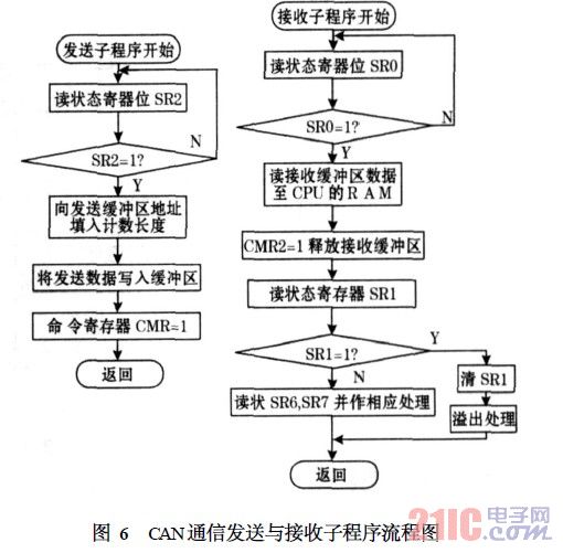 CAN通信子程序主要包括3个部分:初始化子程序、发送子程序、接收子程序。在初始化子程序中主要是对系统的一些验收码寄存器、定时寄存器、输出控制寄存器、定时寄存器、工作模式寄存器、中断定时同步等参数进行设置。CAN通信中的发送与接收子程序的程序流程图设计如图6所示。在发送子程序中主要是读取状态寄存器位SR.2,看看SR.2是否为1,如果该位为1则进行相应的发送准备工作,同时将命令寄存器CMR.0置请求发送,发送完毕后就自动返回。而在接收子程序,先要读状态寄存器位SR.0,看看是否允许将缓冲区数据读取到CPU的RAM中,读取完毕后就释放接收缓冲区,再看看SR.1是否为1,为1则对SR.1进行清除并作溢出处理,否则就读取SR.6与SR.7并对其作计时器警告及相应处理。