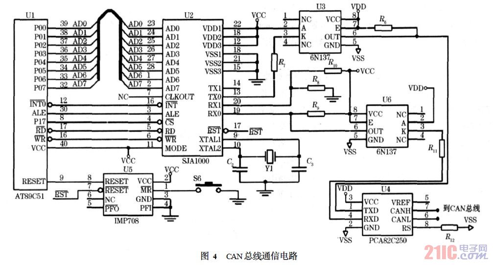 考虑到现在的智能测试设备日益趋于网络化,则将CAN总线通信功能也设计进了此嵌入式超声波测距仪中,CAN总线通信电路系统主要有AT89C51微控制器、独立CAN通信控制器SJA1000、CAN总线驱动器PCA82C250及复位电路IMP708组成。CAN总线应用节点具体电路设计如下图4所示。为了提高系统的抗干扰能力,设计在SJA1000和CAN总线驱动器PCA82C250之间增加了光电隔离器6N137。当微处理器AT89C51将测距结果数据通过P0口发送到CAN总线控制器SJA1000,由SJA1000将并行数据转换为串行数据从端口TX0发出,经过光电隔离器6N137后到达CAN总线驱动器PCA82C250,最后将数据发送到CAN总线上。相反,来自CAN总线的数据也可以经过相应电路到达微处理器。这样就可以实现测距仪与上位机的通信功能。