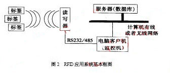 无线射频识别技术(RFID, Radio Frequency Identification)是一种非接触的自动识别技术,其基本原理是利用空间电磁波的耦合或传播来进行通信,以达到自动识别被标识对象,获取标识对象相关信息的目的。最简单的RFID系统由标签(Tag)、读写器(Reader)和天线(Antenna)3部分组成,配合计算机网络和软件支持可以组成一个RFID应用系统(图2)。RFID运用无线电技术进行通讯,信息储存在标签中的一个小硅片中。标签进入磁场后,接收解读器发出的射频信号,凭借感应电流所获得的能量发送出存储在芯片中的信息(Passive Tag,无源标签或被动标签),或者主动发送某一频率的加密信号(Active Tag,有源标签或主动标签);解读器读取信息并解码后送至中央信息系统进行有关数据处理。