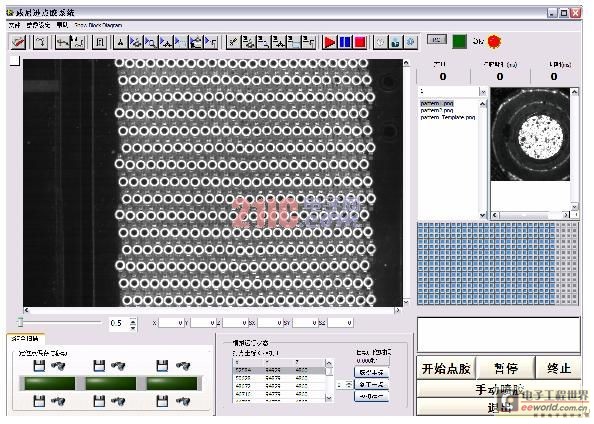 首先通过1394相机拍照获得二极管杯子图像信息,再通过NI Vision Module中自带的一些视觉判断模块,快速找到被点胶二极管杯子XY像素坐标,经过换算得到XY实际运动坐标,通过运动控制卡NI-7344和NI-6601脉冲卡,控制点胶阀运动和点胶。运动执行系统采用了松下伺服系统,保证运动的准确。通过NI-6601脉冲卡控制点胶速度,保证了点胶一致性。由于采用了NI的运动控制和相关产品,使得开发时间大大缩短。给客户将产品投入市场节省了大量时间成本。