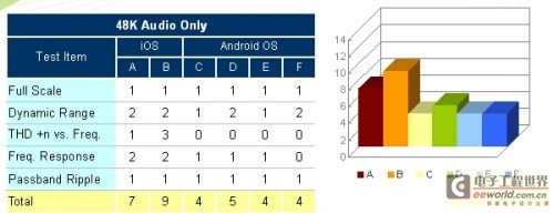 从表三可以看出,受测品A与B在五个测项中的表现与前一个测试情境(44K音频输出)相似,但其余四台受测品则在总谐波失真这个项目的表现则明显产生落差,失真程度较为严重,为什么会普遍出现这样的现象呢?由于这四台受测品均是采用Android操作系统,而Android的原始码是预设为会对48K音源进行重取样(Re-sampling)成44K,因此会造成明显谐波失真的现象。由此观之,Android系统会对48K音源进行重取样而影响音质的现象并未被相关厂商注意到,也才会使这样的问题普遍出现在不同品牌的Android平板装置中。