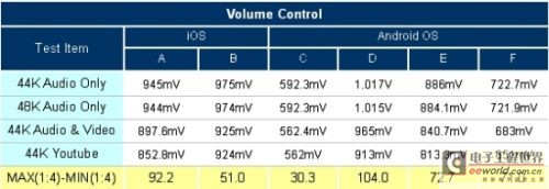在这个测试情境中我们便列出四种可能声音来源,来量测所产生的输出音量,并进一步比较这四种来源间音量的差距,差距越小代表越不会对使用者产生音量差异的冲击。根据表六可以看出,以受测品C的音量差距为最小,仅有30.3mV,受测品在播放44K本机音频档与播放Youtube内容时差距最大,达到104 mV,这样的差距就有可能对使用者在音源切换时造成聆听时的不舒适。