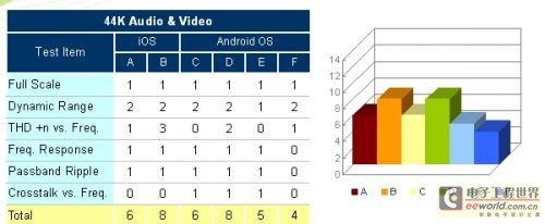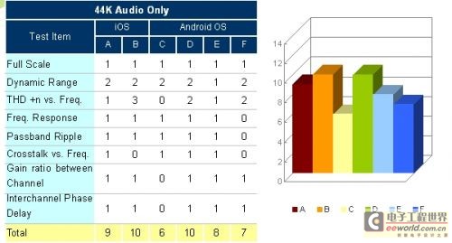 除了单纯的音频播放外,影片的播放也是常见于平板装置的应用中,因此这个测试情境就是在观察产品同时处理影音频号时,本机DAC/ AMP的音质表现能力,共有六个测试评量项目。在与第一个测试情境(44K音频输出)比较后可以发现到,加上了影像档的播放后,受测品A出现了串音变大的现象,受测品E则产生较多的谐波失真,相较之下受测品B与D则是不论是否加入影像档播放,都能维持相同的音质表现,因此可以得知在实际的影音娱乐享受(同时播放音频与影像)上,这两台产品能提供较稳定的声音效果。