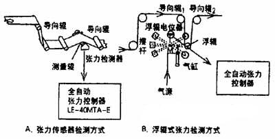 张力检测装置基本上有三种:一是用张力传感器(即张力检测器)对张力进行检测,通常两个张力传感器配对使用,将它们装在检测辊的两端(如图1A所示),料带通过检测辊施加负载,使张力传感器敏感元件产生位移或变形,从而检测出实际张力值,并将此实际张力信号送到全自动张力控制器,最终实现张力闭环控制。目前,张力传感器有板簧式微位移张力检测器(日本三菱LX-TD型),应变电阻片张力检测器(美国蒙特福T系列)和压磁式张力检测器(中国ABB枕式系列)等等。其优点是检测范围宽,响应速度快、线性好。