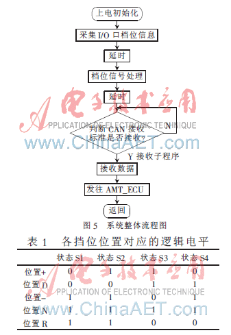 Initialize()完成单片机硬件初始化(手柄ECU初始化、应用程序初始化等)。上电初始化后,单片机开始采集I/O口挡位的电压信号,并存储到片上存储单元。与主机的CAN通信将以中断形式完成。图5为系统整体流程。
