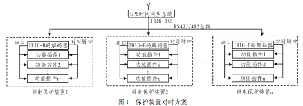 一个变电站内配置一套时间同步系统,该时间同步系统可由一面或多面时钟装置屏组成。时问同步系统的结构可采用主从式或主备式结构。时间同步系统与被授时的继电保护装置之间采用EIA RS-422/485接口标准来传输IRIG-B(DC)码信号。不同厂家的保护装置仅需具有EIA RS422/485接口的IRIG-B码解码器,即可接入变电站统一对时网络。保护装置内嵌IRIG-B码解码模块,采用图1中的对时模式,即由IRIG-B码解码模块检测出时间信息和对时脉冲,通过串口将时间信息直接下发到各个功能插件。各功能插件都直接从对时模块引入对时脉冲。