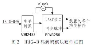 外部接入的IRIG-B编码信号是用RS485电平传输的差分信号,需变换为TTL信号,转换芯片为AD公司的ADM2483,该芯片是带隔离的增强型RS485收发器,有失效保护、短路电流限制、热关断和恢复等功能。外接的5 MHz信号来源于5 MHz的有源晶振。硬件框图如图2所示。