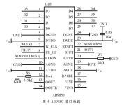 AD9850接口电路如图4所示,D0~D7口与DSP的数据线D0~D7相连。复位引脚与DSP的PC0口相接,高电平复位,复位时间不低于40ms。FR_UD引脚与DSP的PC1脚相接。WCLK1是地址线经过可编程逻辑器件GAL16V8或逻辑后产生的片选信号。Rset连接3.9k?赘的电阻,设定最大的输出电流为10mA。IOUTB端连接24?赘的电阻,作为电流输出补偿电阻。